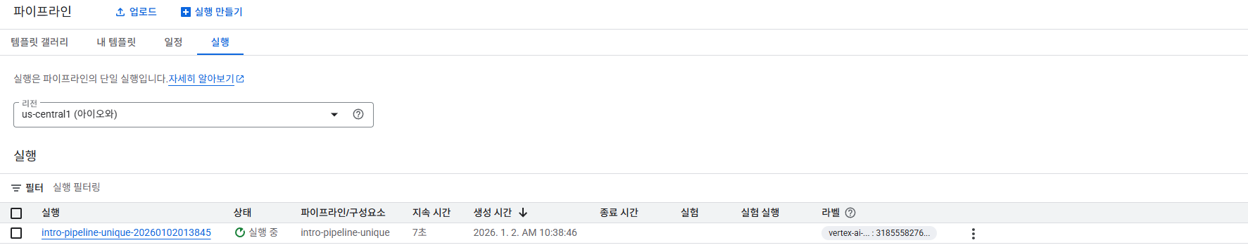 참고: @dsl.pipeline 데코레이터에서는 PIPELINE_ROOT 클라우드 스토리지 경로를 정의하고 있음. 여기에 이 정보를 포함하지 않았다면, 파이프라인 실행을 생성할 때 지정해야 했을 것임. 아래에서 볼 수 있듯이 이 정보가 필요.