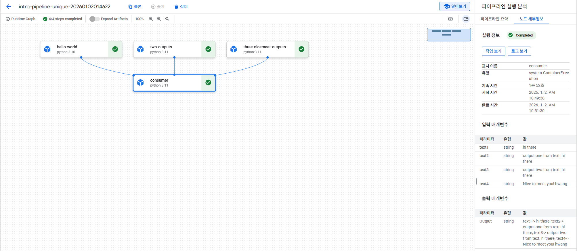 파이프라인은 입력 매개변수를 가져와서 이 매개변수를 첫 번째 세 파이프라인 단계 (hw_task 및 two_outputs_task)에 인수로 전달. 그런 다음 네 번째 파이프라인 단계 (consumer_task)에서는 첫 번째와 두 번째 단계의 출력을 사용. hello_world 컴포넌트 정의는 하나의 무명 출력만 반환하므로 hw_task.output로 참조. two_outputs 작업은 두 개의 명명된 출력을 반환하며, 이를 two_outputs_task.outputs[“"]로 액세스.